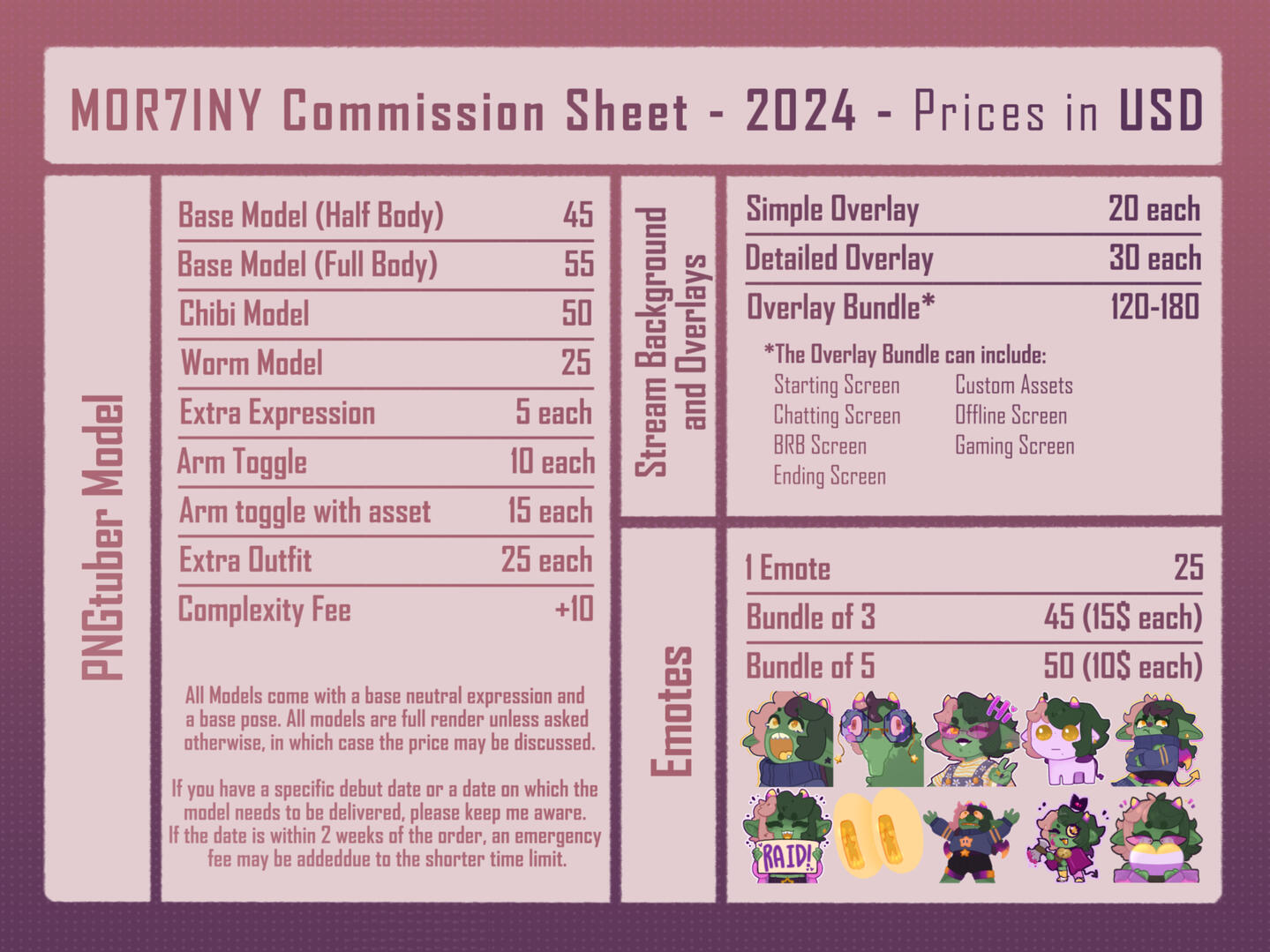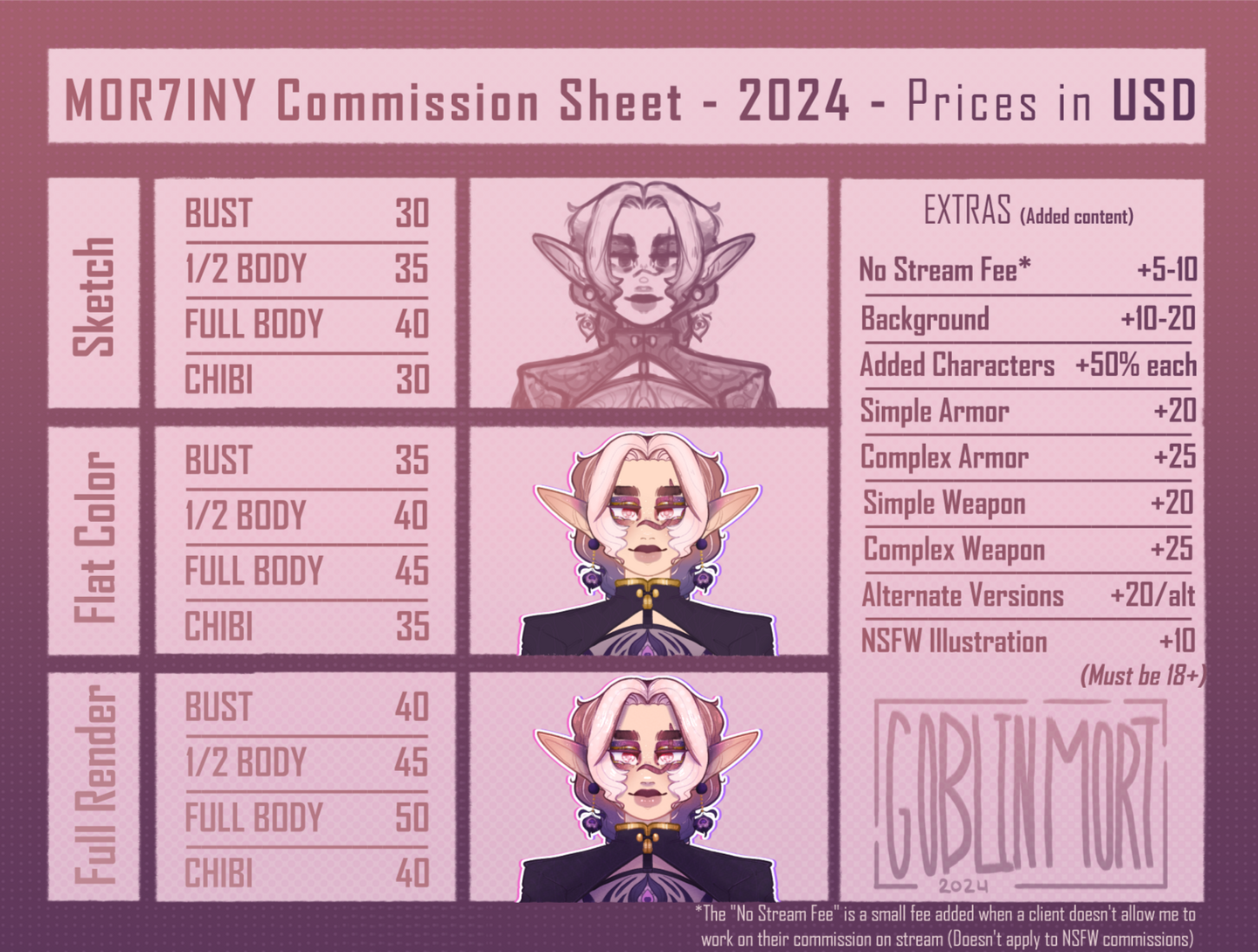 ☆ A 5$ to 10$ fee will be added to the final price as a "no stream fee" if a client requests for me not to draw their commission on stream, said fee will vary depending on how big the commission is.